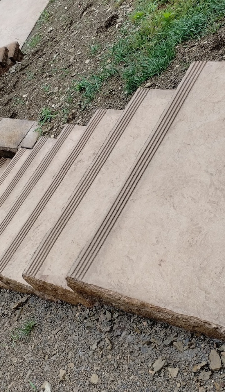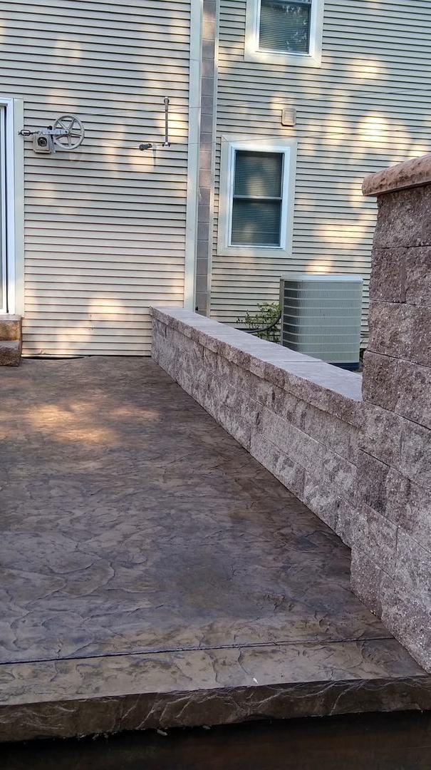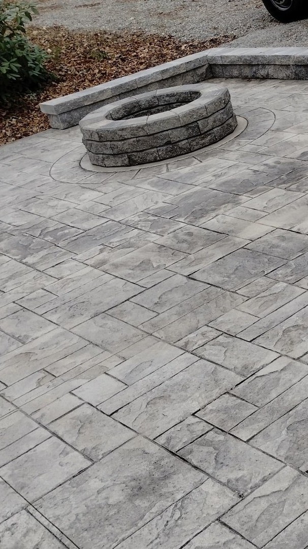 Stamped concrete is concrete that is stamped or textured to resemble slate tile, stone, or brick or any of dozens of patterns available. It involves adding an integral color to the concrete, adding an accent color, called a release powder, as it also keeps the stamps from sticking to the surface, and stamping a pattern into the concrete with polyurethane stamps. The most popular pattern is Ashlar Slate, both for the ability of the pattern to produce a rich two tone color and for the straight lines of the tile to conceal the necessary saw cuts better than a random pattern will. There are numerous color choices available, both for the integral color and for the accent color. Stamped concrete is a very durable and less expensive method than using authentic materials such as stone, slate, or brick, but must be sealed with a high quality sealer to protect the surface and enhance the colors. Sealer is generally applied 3 to 4 weeks after placing the concrete to provide ample time for the concrete to cure and should be applied every 2 to 3 years thereafter or whenever it starts to look faded or worn. The downloadable files below will provide some ideas of what is available in colors and patterns. If you would like a brochure and color chart mailed to you just let us know. For more photos, see our Photo gallery and Facebook page.