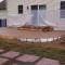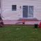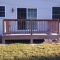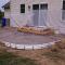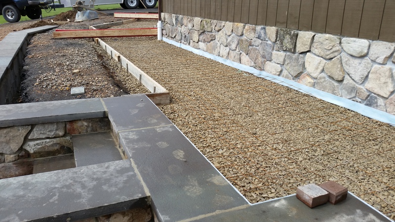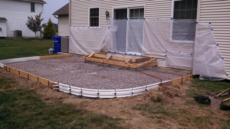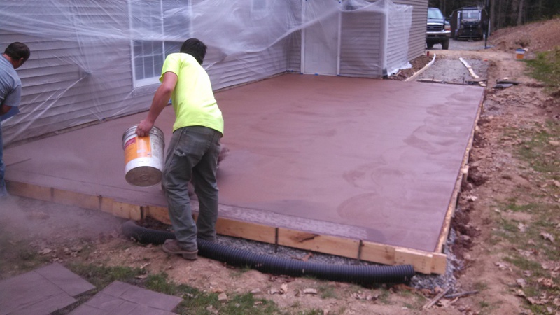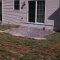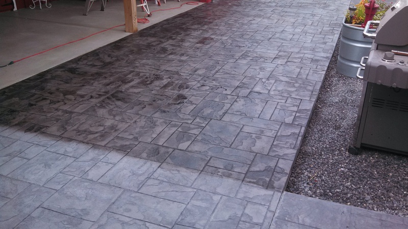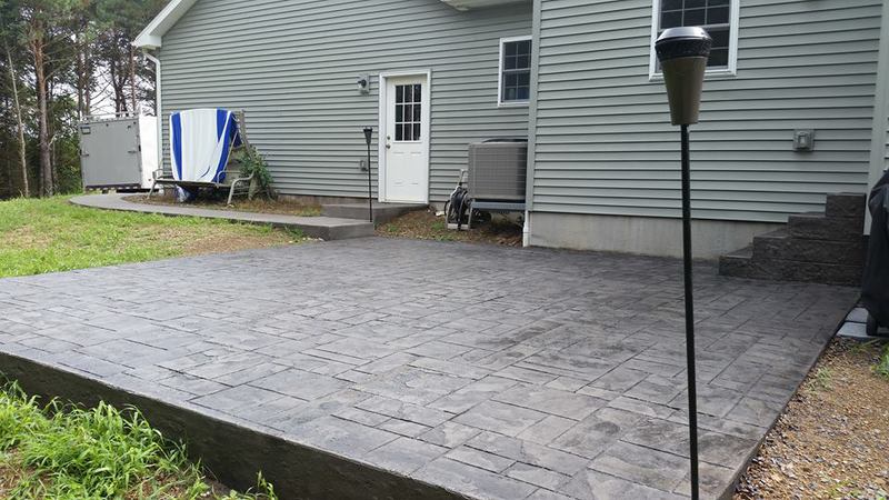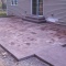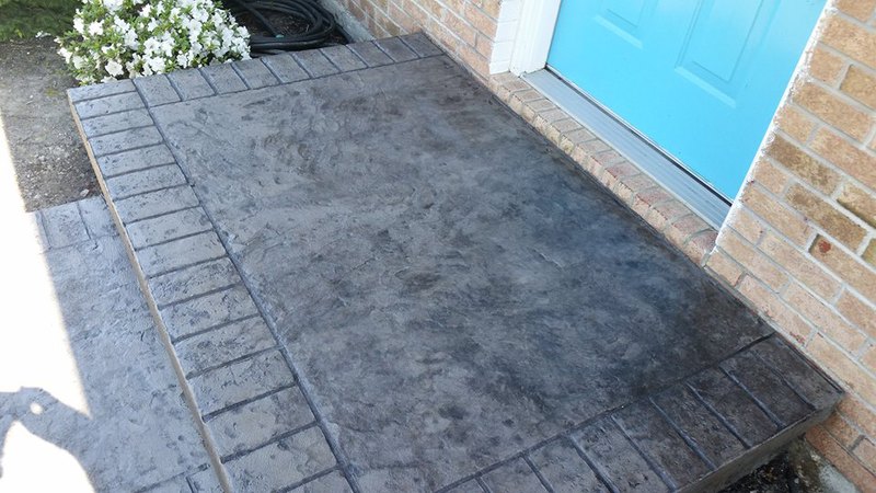 A patio in Sunbury. Midnight Bay integral color with Charcoal accents in an Ashlar Slate pattern. The steps were formed with Stone Edge step forms and stamped with a Slate texture. The sidewalk adjoining the patio is colored to match. The sidewalk in front of the house is plain concrete.