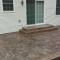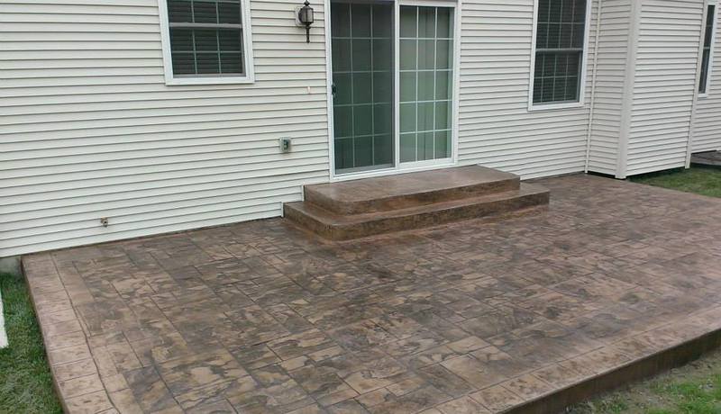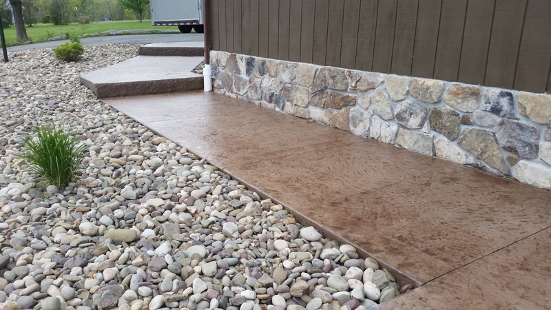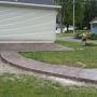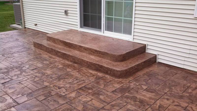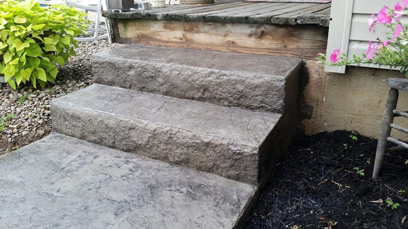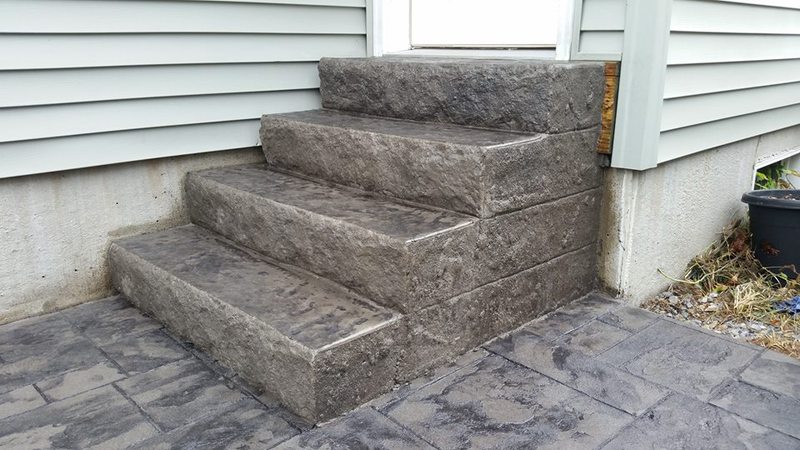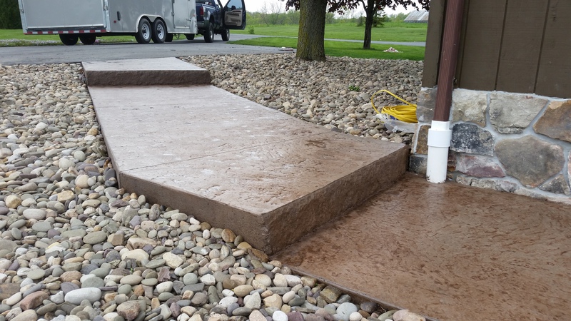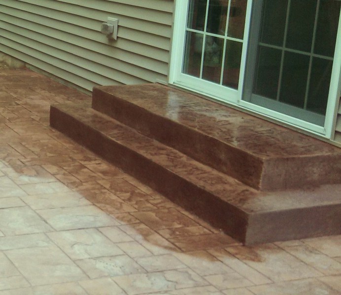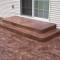 Sand Integral color with Nutmeg accents in an Ashlar Slate pattern. These steps were formed with smooth sides and square corners to match the corners of the patio. The sidewalks are Bluestone Slate seamless texture with a tile border.