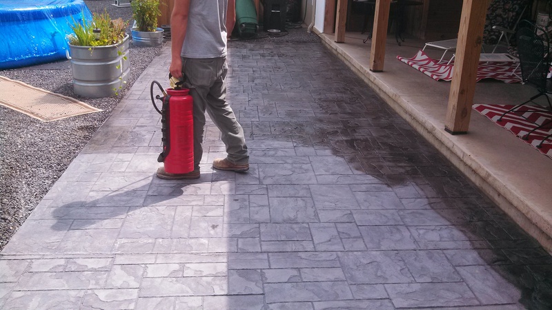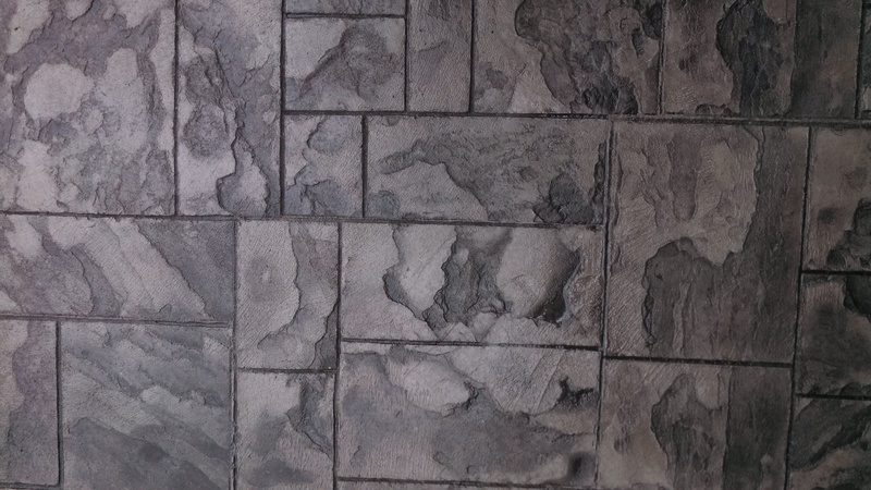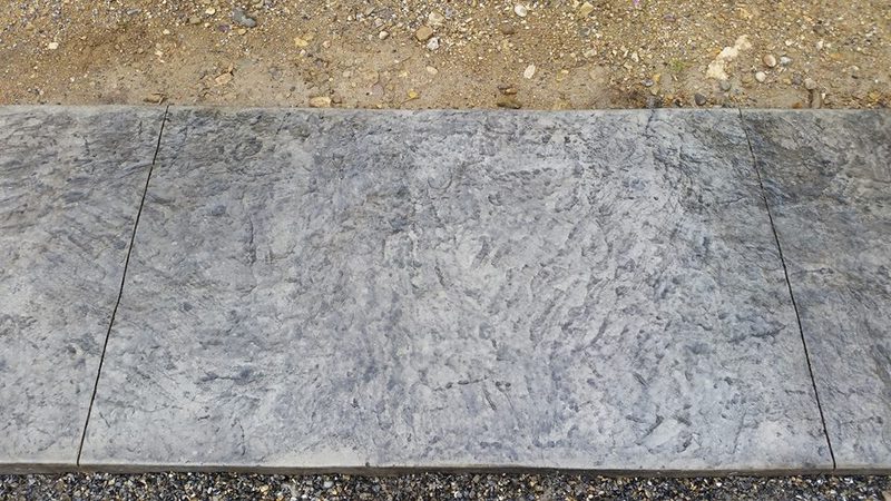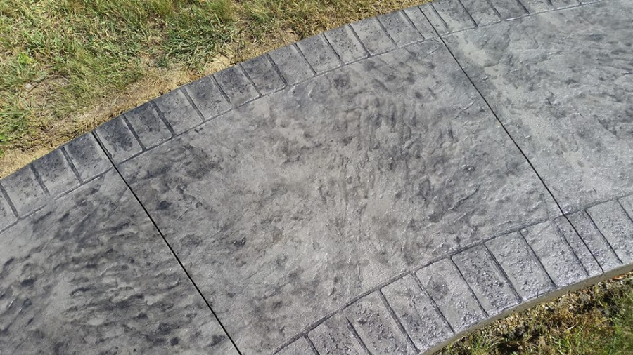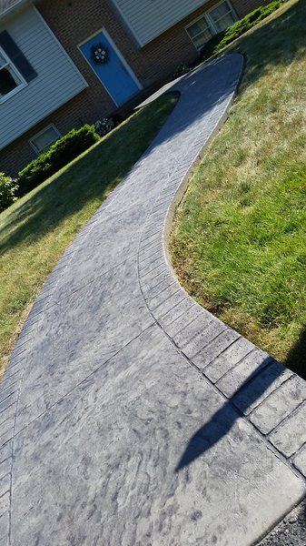 A sidewalk in Selinsgrove. Slate integral color with Charcoal accents. This sidewalk was stamped with a seamless Bluestone texture and a Brick border.