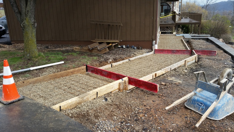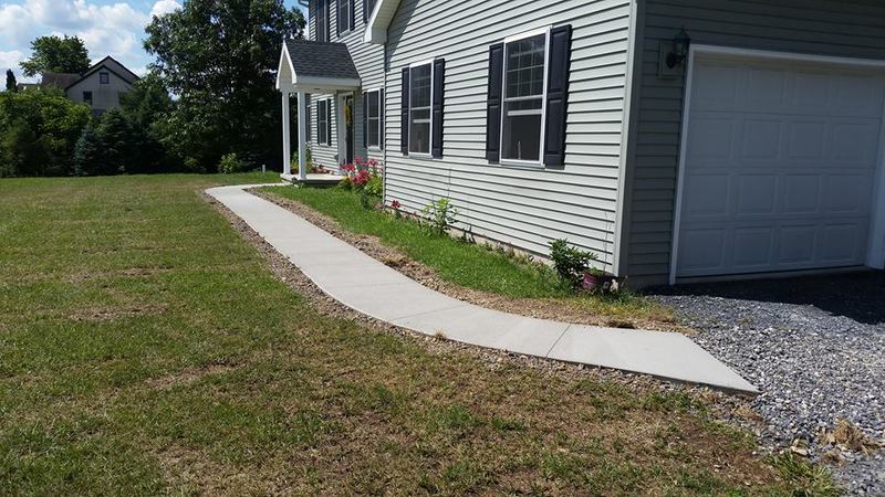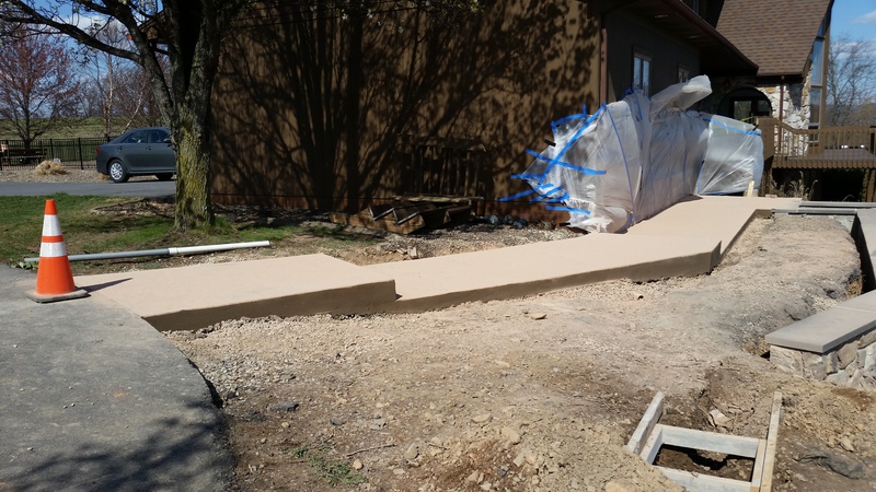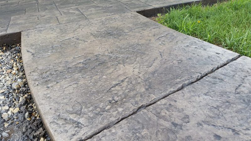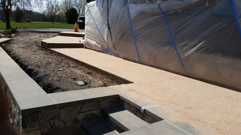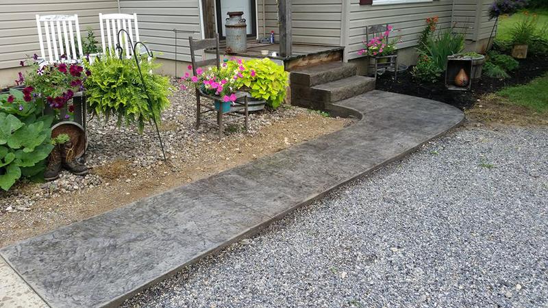 A sidewalk and steps in Mt Pleasant Mills. Bluestone texture for the sidewalk and Stone edge step forms and Slate texture for the steps. This concrete had no integral color added, just a Charcoal accent color.